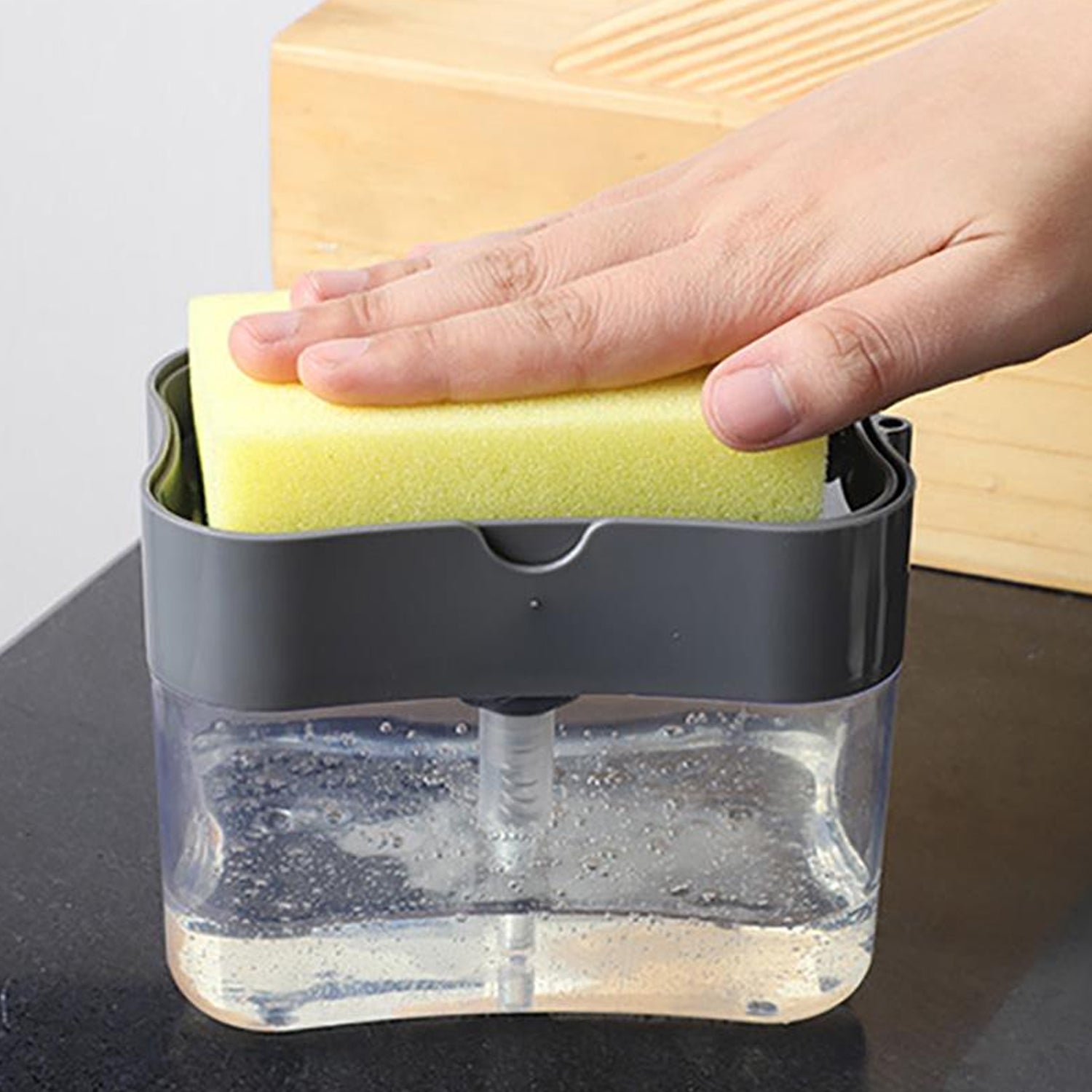 - Use the included sponge to press down on the pump, which dispenses the perfect amount of dish soap up onto the sponge.