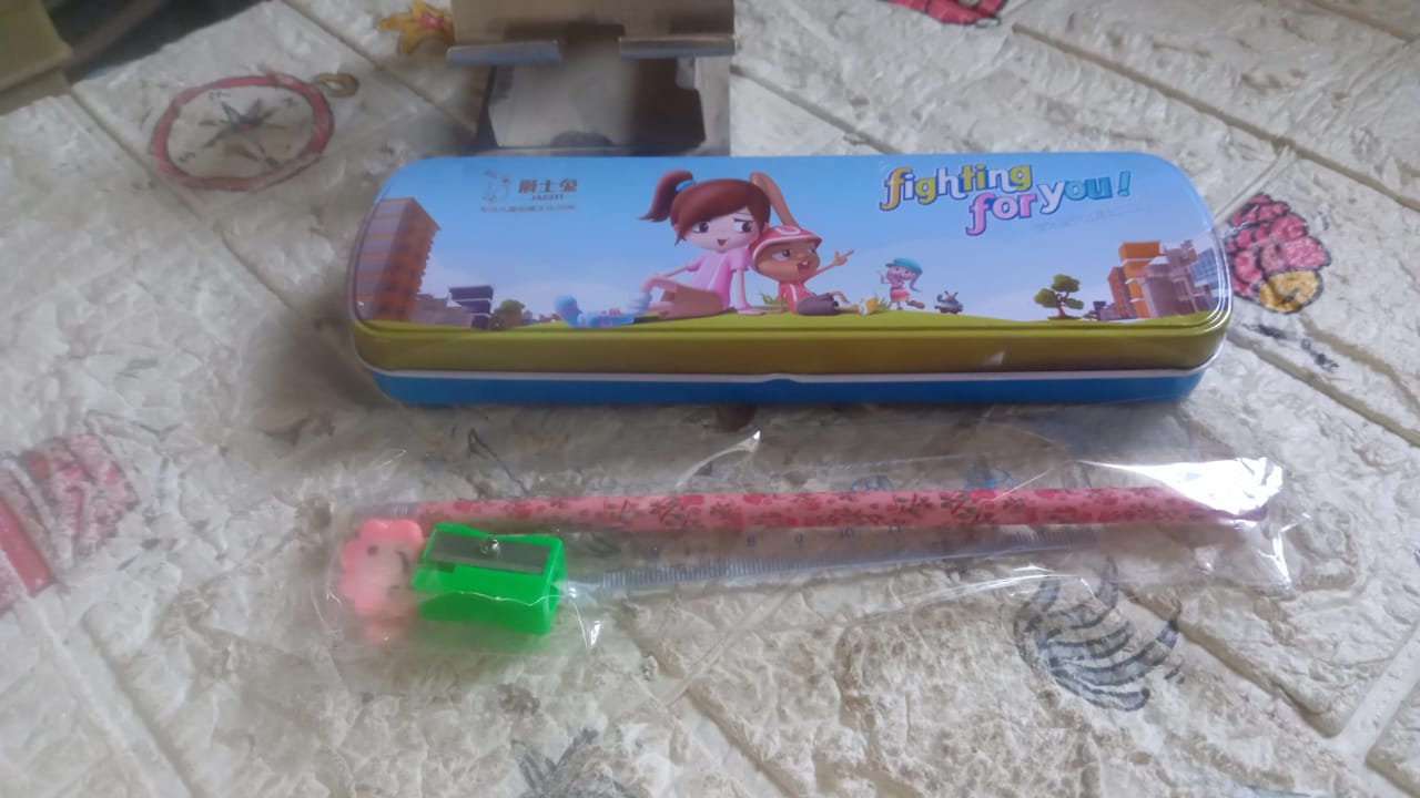 - Multifunctional compass Box With 1 Pencil, 1 Eraser, 1 Scale, 1 pencil Sharpener, 6 Pen Refill, 1 black pen for Boys & Girls for School, Small Size Cartoon Printed Pencil Case for Kids Birthday Gift (12 Pcs set)